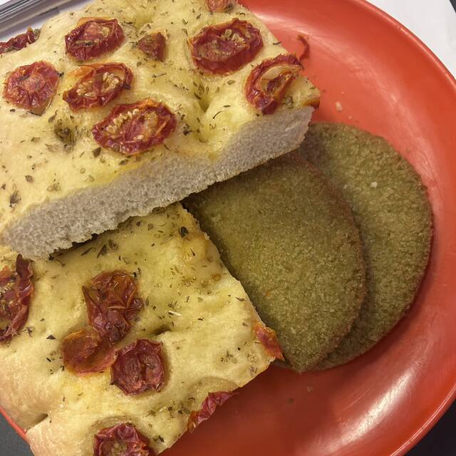Non una grande ricetta, quanto piuttosto un salva pranzo in ufficio quando non è avanzato nulla dalla cena. Focaccia con pomodorini e burger veg ai broccoli di Eurospin. (Ogni tanto si può mangiare anche qualcosa di processato, basta che non sia la normalità)