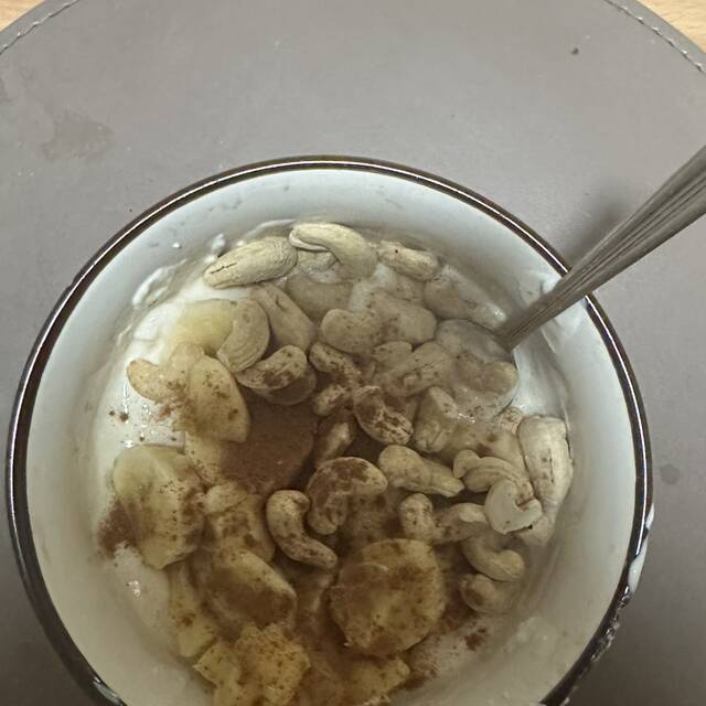 Spuntino proteico con yogurt di soia, banana, anacardi e cannella 🍌💪