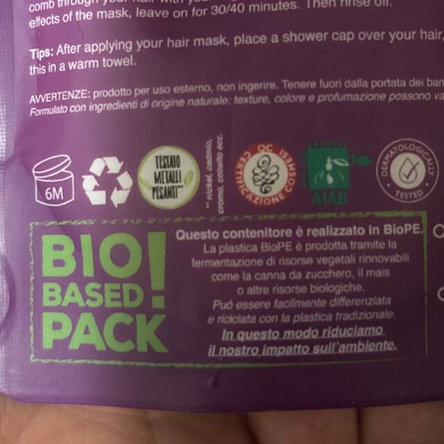 Questa è una maschera per capelli riparatrice, non avevo ancora trovato il tempo per lasciarla in posa 😅 nonostante l'avessi acquistata da un pó su EccoVerde, al primo impatto mi ero pentita vedendo una maschera da 100 ml in confezione dubbia, invece mi ha sorpreso questo bio based pack. Vi lascio il dettaglio della composizione in foto. …Ah ovviamente anche la maschera é ottima!
