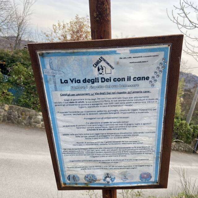 Questo cartello secondo me è importantissimo, anche io e il mio ragazzo vogliamo fare la via degli dei, in tenda, con il cane! Il problema principale è quando viene fatta, noi la faremo in marzo/aprile, in modo che faccia ancora fresco per poter camminare in serenità.