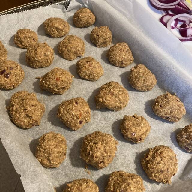 Ho messo una sola mela gialla grossa a pezzetti e una manciata di uvette (per finirle). 1 uovo, un po' di latte vegetale alla mandorla (non avevo altro), 1 etto e mezzo di farina e…40 grammi di zucchero (la ricetta originale ne chiedeva 1 etto e mezzo).
