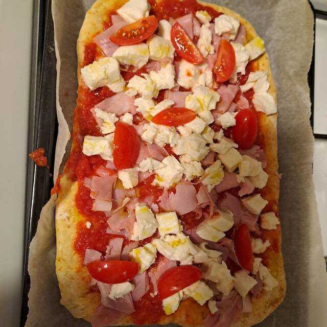 Impasto secondo la ricetta di Cucina Botanica: 260 gr di farina (mista tra integrale e 0) 110 ml di acqua 60 mo di olio Un cucchiaino di sale
