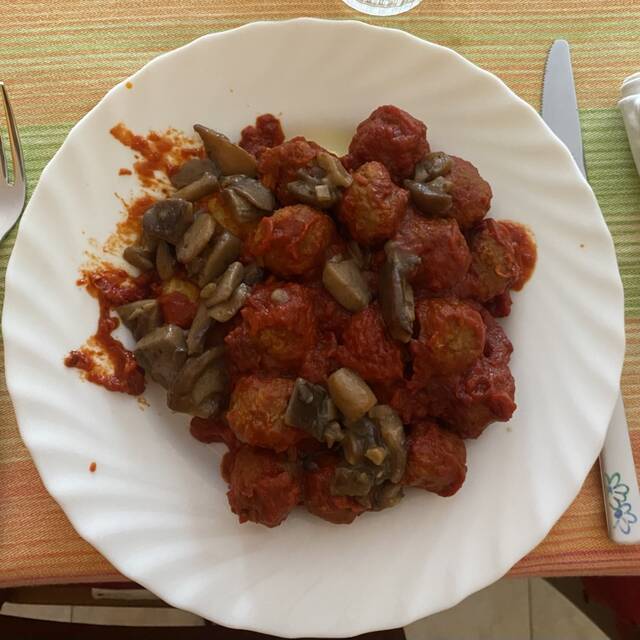 Polenta con funghi, polpette vegetali e salsa al sugo. Non sono capace di impiattare senza sbrodolare 😅