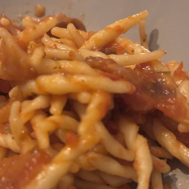 Trofie al sugo di melanzane Marito (va a fare la spesa al super nel suo giorno di riposo -l'Alveare era chiuso) torna dicendomi: ho preso le melanzane perché è da tanto che non le prendi Io:😒 Quindi non é di sicuro una ricetta di stagione ma abbiamo fatto un sugo di melanzane saltate con polpa di pomodoro peperoncino e origano.