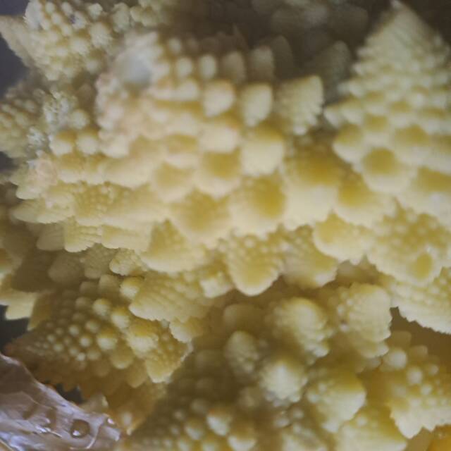Mi sembra un cavolo extra terrestre visto la sua forma e invece è reale e ottimo. È il cavolo cimoso o romanesco. L'ho cotto a vapore senza sale; poi ci metterò un giro di olio extra vergine, ma è già buono così tiepido.