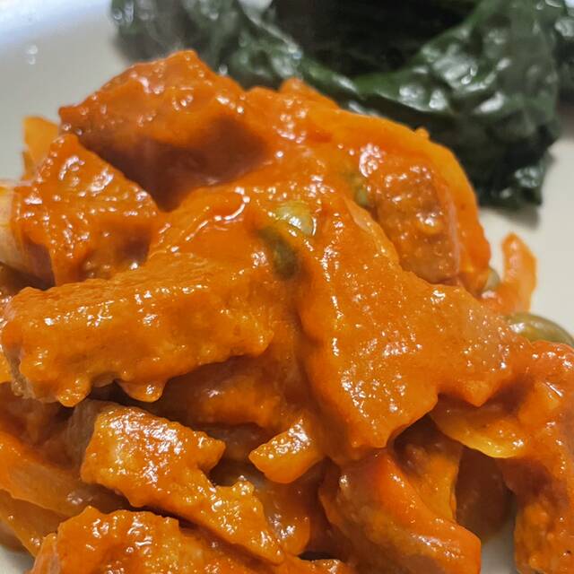 Cena con seitan al pomodoro e capperi! Contorno di spinaci. Devo dire che il de tan non lo amo molto, proprio non riesco a farmelo piacere, forse devo trovare il marchio giusto. Questo è uno dei pochi modi con cui riesco a mangiarlo.