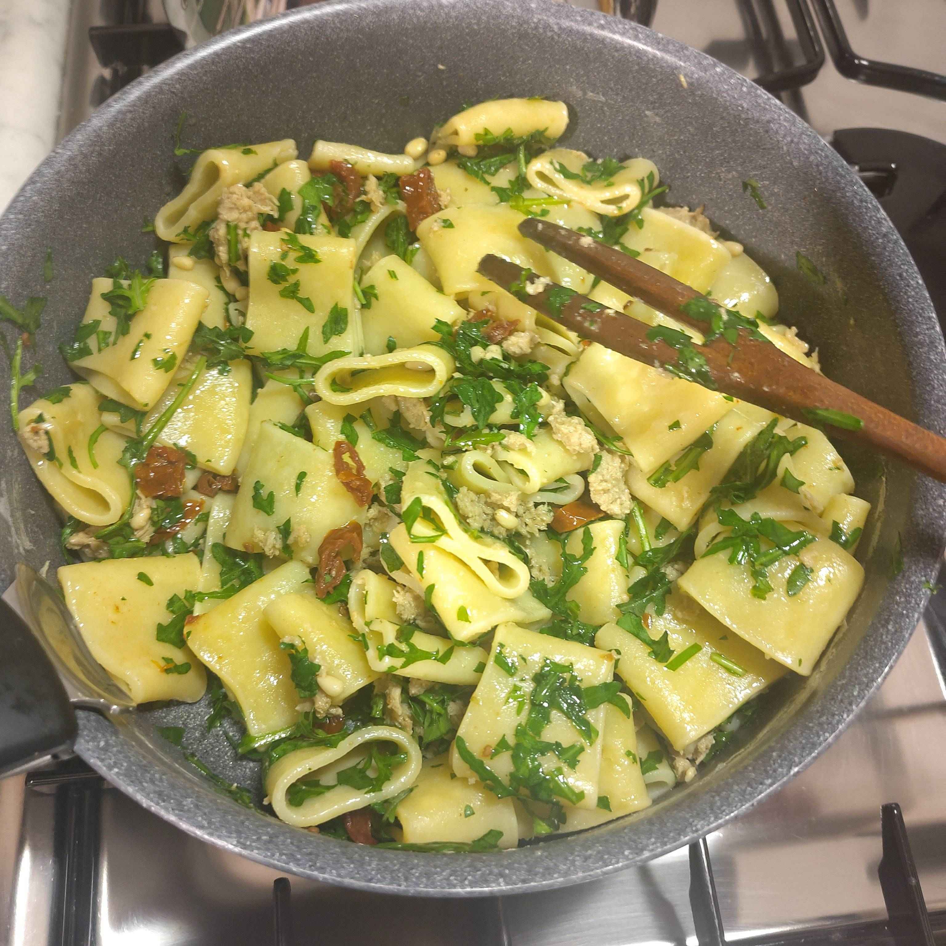 Cena gourmet vegan in 5 minuti, yes 👍 - pasta fresca - rucola tagliata - tonno vegan - pomodorini secchi - pinoli