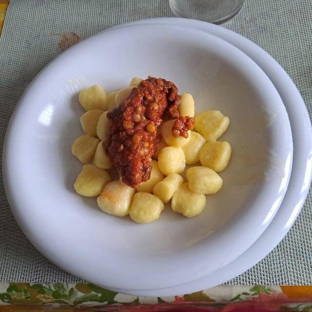 Gnocchetti con sugo di funghi secchi, lenticchie e pelati.