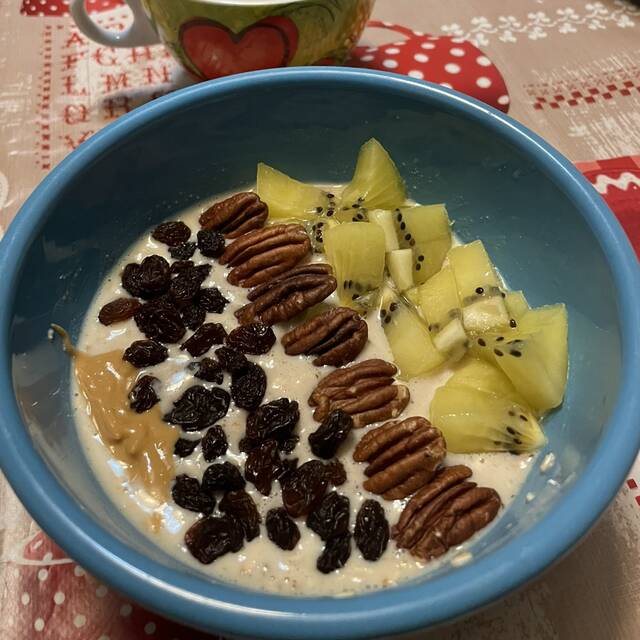 Buongiorno a tutti!!! Porridge di avena con kiwi, noci pecan, uvetta e burro di arachidi 💚