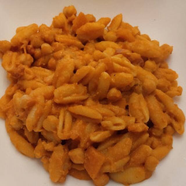 Ho preparato pasta al pomodoro e ceci, usando solo ingredienti che avevo già in casa: cereali, legumi e verdure, proprio nello spirito della sfida 💚