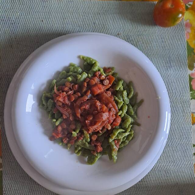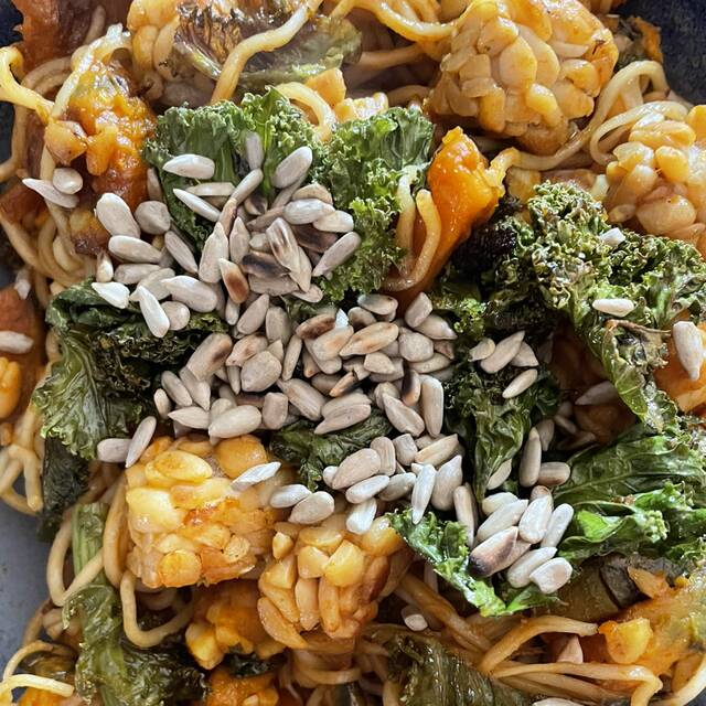 Oggi a pranzo spaghettini con tempeh di soia autoprodotto, zucca e cavolo riccio (li avevamo fatti al forno ed erano avanzati). Il piatto è molto pieno perché c'è molta verdura ed è ottimo!