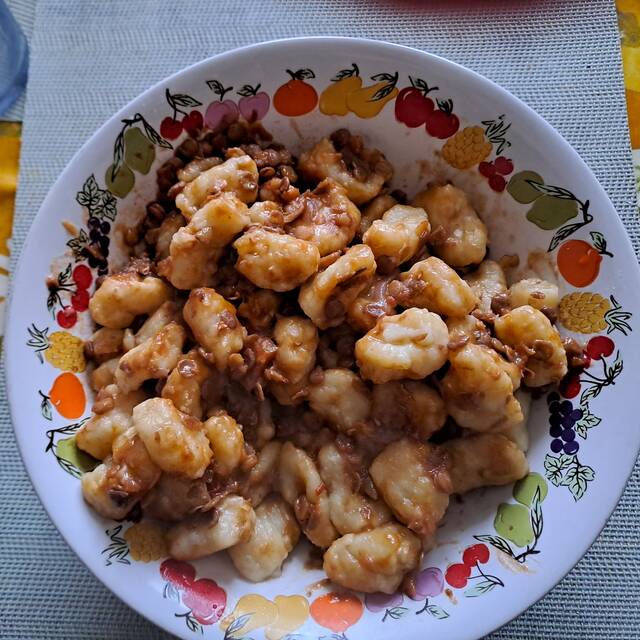 Gnocchi di patate con tofu, conditi con sugo di lenticchie.