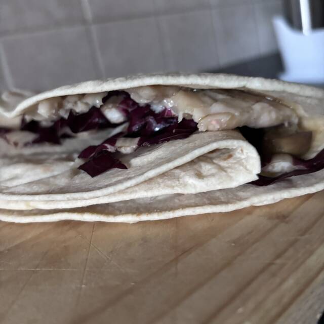 Piadina all'olio, cannellini schiacciati per ottenere una crema con pepe e spezie, radicchio a crudo. Pranzo velocissimo ma gustoso