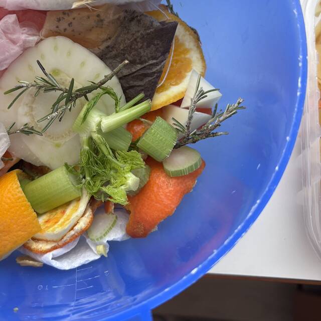 Scarti destinati al compost: sono i resti dell'insalata d'inverno (carote-finocchi-arance) e del rosmarino per le patate al forno.
