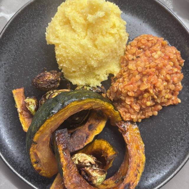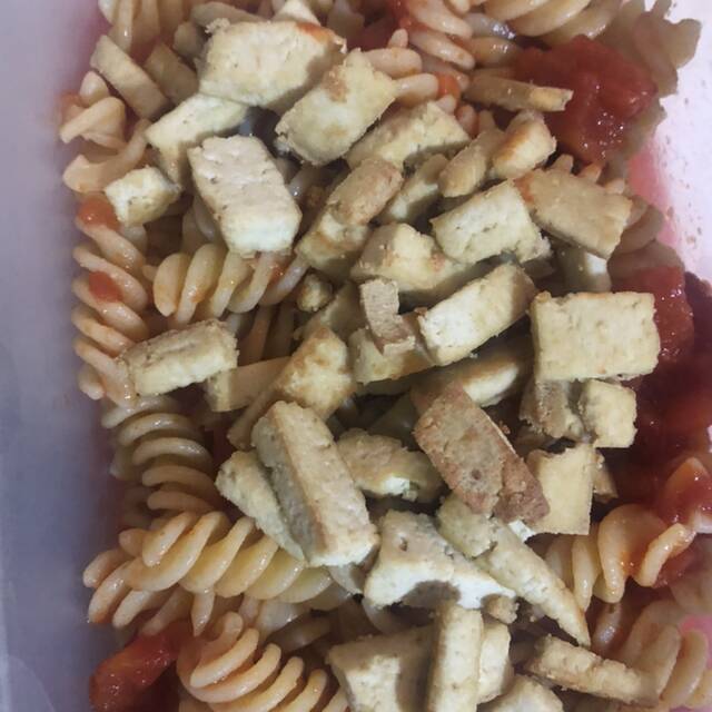 Oggi pranzo veg molto semplice: Pasta con sugo pomodori + soffritto di sedano-carote-cipolle + tofu croccante Zucca al forno Semplice nutriente e completo