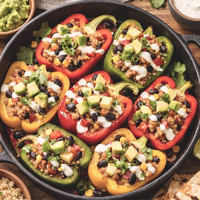 Preparazione 1. Cuoci la quinoa Sciacquala bene e cuocila in acqua leggermente salata (1 parte di quinoa, 2 parti d’acqua) per circa 12–15 minuti. Sgrana e metti da parte. 2. Prepara il ripieno In una padella soffriggi cipolla e aglio con un filo d’olio. Aggiungi pomodoro, fagioli neri, mais, spezie, sale e pepe. Cuoci 5 minuti, poi unisci la quinoa. 3. Prepara i peperoni Taglia i peperoni a metà per il lungo e rimuovi semi e filamenti. Sistemali in una teglia leggermente oliata. 4. Riempi e inforna Farcisci i peperoni con il ripieno. Cuoci in forno statico a 180°C per 30–35 minuti, finché i peperoni sono morbidi.