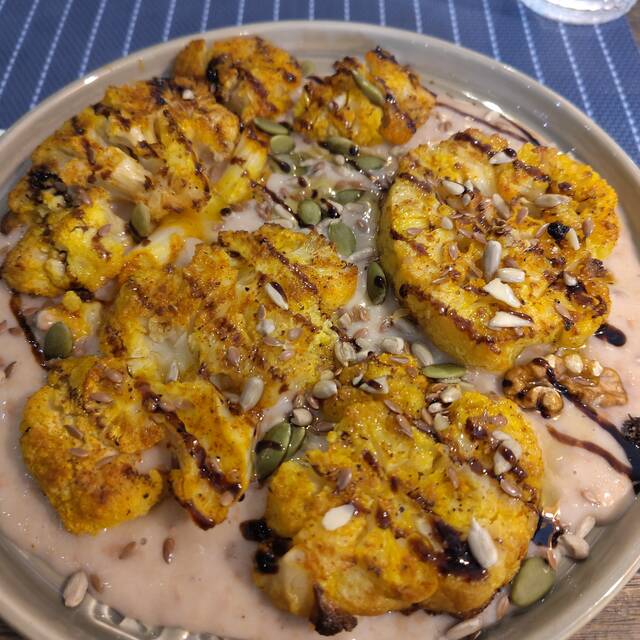 Bistecchine di cavolfiore al forno con semini vari, aceto balsamico e crema di cannellini.