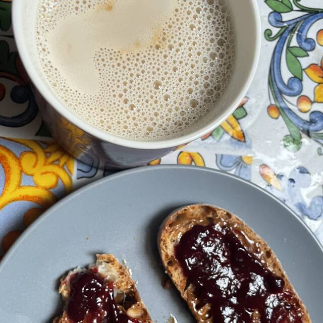 Oggi come tutti i giorni in realtà, collezione ricca di proteine e carboidrati. Bevanda di avena crema alle nocciole su due fette di pane e uno strato di marmellata. Delizioooosa.