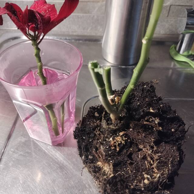 il rametto rotto prima di metterlo in acqua dovresti bruciare il latte bianco che esce perchè quello non permette al fiore reciso di tirare l'acqua e quindi appassisce più velocemente (trucchi da fioraia 😃)