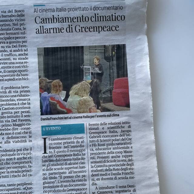 Al cinema Italia di Belluno è stato proiettato un documentario di Greenpeace e ReCommon sugli effetti del cambiamento climatico sul vivere quotidiano di uomini, animali e piante. Al termine della proiezione si aperta una tavola rotonda di confronto. A introdurre il tema Denise Casanova, segretaria di Cgil Belluno che ha posto l'attenzione sui 12 miliardi di euro che l'Italia dovrà sostenere a causa degli eventi metereologici estremi dell'estate 2025.