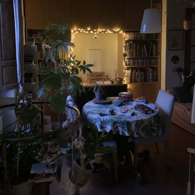 Le piante, i libri, i dvd e le luci attorno al Gohozon assieme alle prime luci del mattino; ecco il mio angolo di calore in casa🏡🥹🔥✨