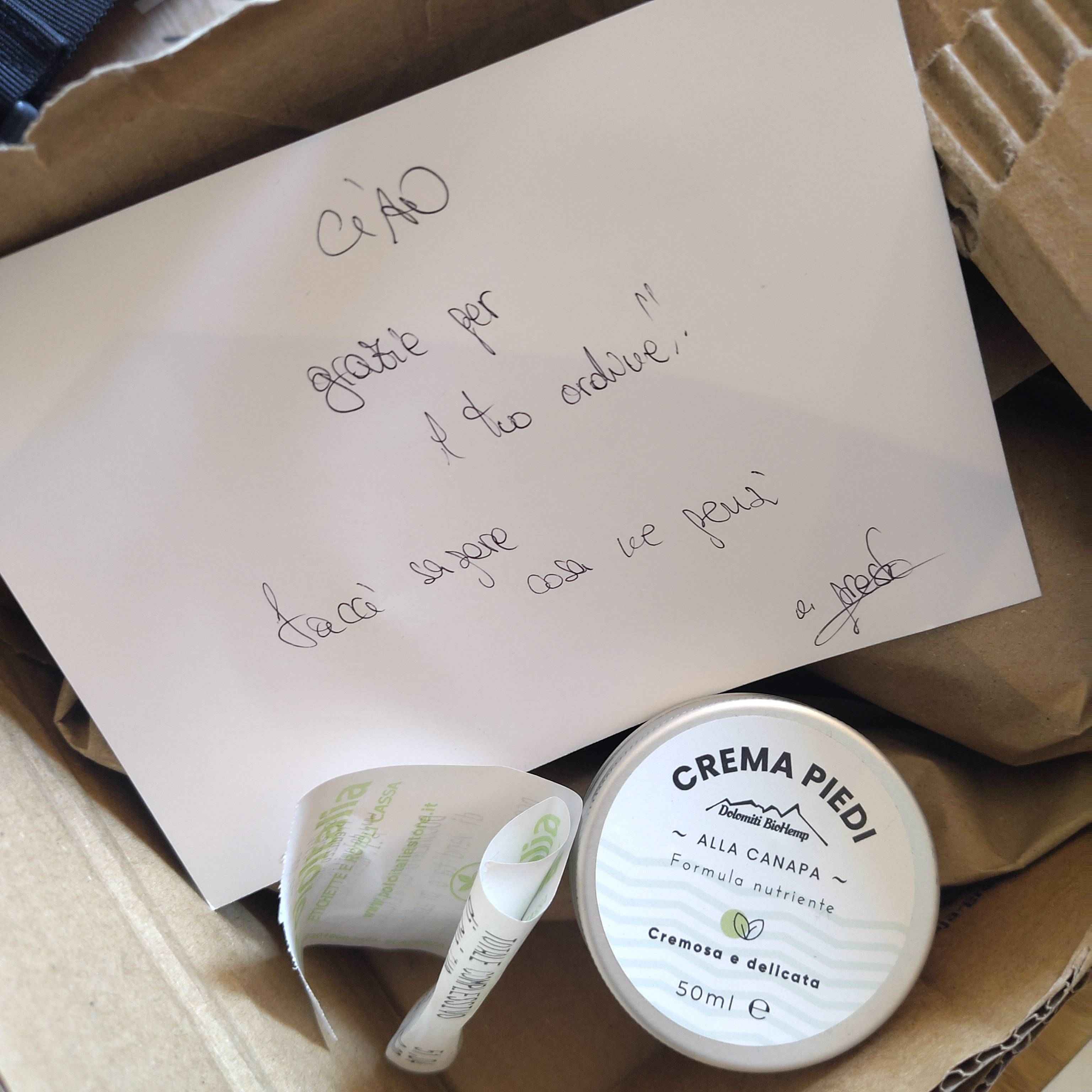 Ho approfittato del 20% di sconto di questi giorni sul sito DOLOMITI BIO HEMP che produce e vende prodotti a base di canapa bio coltivata a Predazzo. Lo scorso anno ho proprio visto con i miei occhi le coltivazioni 🤩 Adoro i loro prodotti e soprattutto sono molto efficaci, la crema piedi, mani e corpo e anche la crema di nonna Nuccia sono must have. Che carini poi un messaggino scritto a mano ❤️ Che bello fosse partner greenapes!