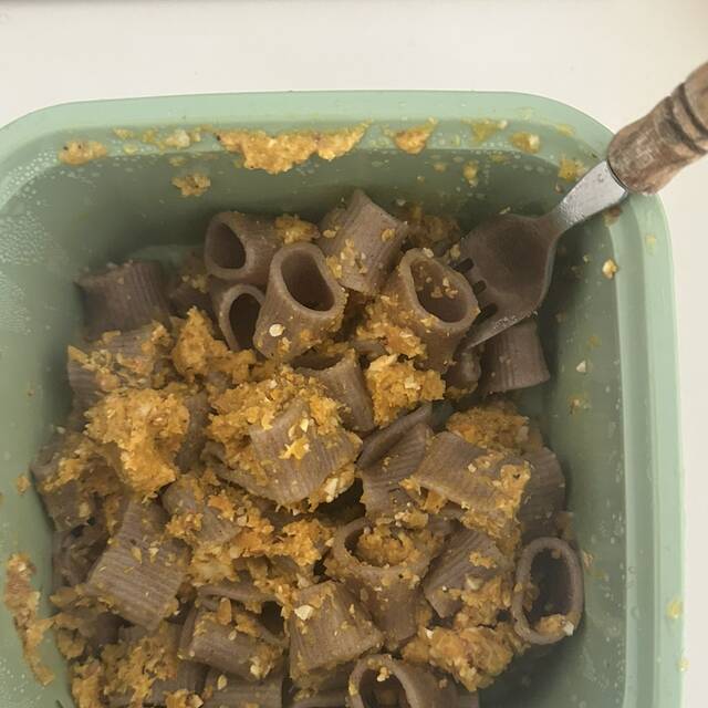 Mezzi rigatoni con pesto di carote al timo, mandorle e lievito alimentare 🥕🤍